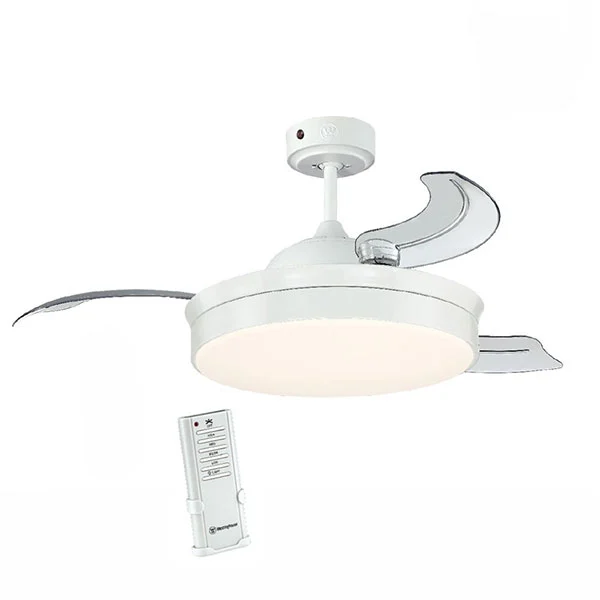 El modelo 73043 Tori Westinghouse cuenta con un acabado en blanco y unas aspas retráctiles traslúcidas, así como iluminación LED regulable integrada.
